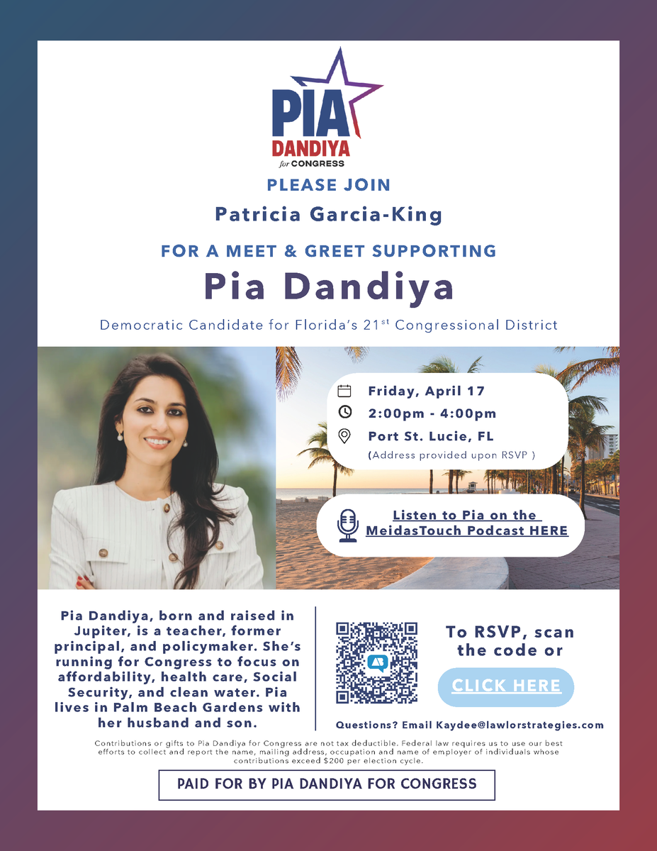 Please register for this locally-hosted event to learn more about Pia, her platform, and her plan to take down Brian Mast so St. Lucie County has a true representative in DC.